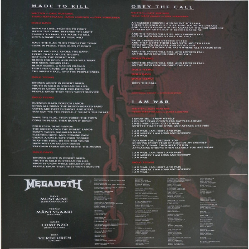 Dave Mustaine'in müziklerinde ele aldığı politik, savaş ve kişisel temalar her zaman dikkat çekmiştir. Kariyeri boyunca bu türdeki en dikkat çekici şarkılarından biri “Hanger 18”dir. Yine, bu son albümde “Hangar 18”e rakip olacak bir şarkı olmayabilir, ancak grubu muhteşem bir şekilde uğurlayan bir dizi kaliteli Megadeth şarkısı bulunmaktadır. Bu son albümün son parçası uygun bir şekilde “The Last Note” olarak adlandırılmıştır ve son sözler “Geldim, hüküm sürdüm, şimdi yok oluyorum” şeklindedir. Genel olarak, albüm ve olağanüstü uzun bir kariyer için harika bir son.