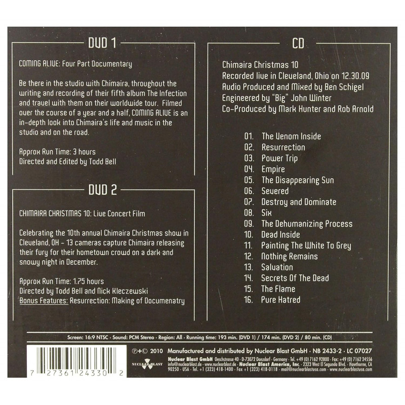 Ferret Music'in plak sanatçısı Chimaira, 2009 tarihli "The Infection" albümüyle büyük ses getirdi. Chimaira, turnesinde başarılı bir yol çizerek, amansız ve coşkulu metal tarzını "Music is a Weapon" turnesinde sahne alarak daha geniş kitlelere ulaştırdı. Chimaira şimdi İKİ DVD içeren bir canlı CD olan "COMING ALIVE"ı yayınlamaya hazırlanıyor. DVD 1 - "Coming Alive": "The Infection" albümünün yapımını ve dünya turnesini konu alan 2 saatten uzun bir belgesel. DVD 2 - CHIMAIRA CHRISTMAS 10: Tüm kataloglarını kapsayan 16 şarkının yer aldığı canlı konser ve canlı ses CD'si Chimaira Christmas 10'u içeriyor.