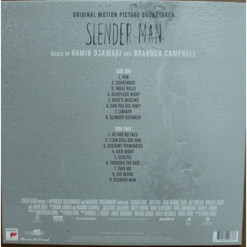 Sınırlı sayıda 180 gr şeffaf siyah beyaz vinil LP basımı. Slender Man, sayısız çocuk ve gencin hayalet gibi kaybolmasından sorumlu olduğu söylenen, doğal olmayan uzun kolları ve belirgin olmayan yüzüyle uzun, ince ve korkunç bir figürün hikayesini anlatıyor. Albümde, Ramin Djawadi (Game of Thrones, Westworld, Iron Man) ve Brandon Campbell (The Thinning) tarafından bestelenen filmin orijinal müzikleri yer alıyor. Motifler ince ve sinsi, çok ağır değil. Hikâyenin yoğun gerilimine mükemmel bir şekilde uyuyor. Klasik korku sesleri bazı anlarda mevcut olsa da, film müziğini doğru yöne çeken çoğunlukla yaylı çalgıların melodileri. Slender Man paketi bir mini poster içeriyor ve çıkış oluğunda gizli yazılar bulacaksınız.